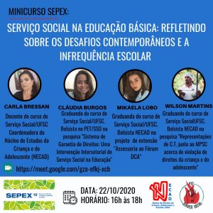 O PET/SSO ofertará, nessa edição, dois minicursos interessantíssimos, confira a seguir: SERVIÇO SOCIAL NA EDUCAÇÃO BÁSICA: REFLETINDO SOBRE OS DESAFIOS CONTEMPORÂNEOS E A INFREQUÊNCIA ESCOLAR, em parceria com o NECAD/UFSC, com a representação do PET pela Petiana Claudia Burgos.